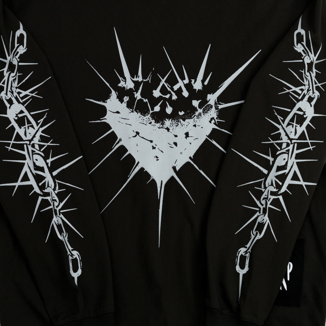 A heart wrapped in spikes glows on the chest, barbed wire chains crawl down the sleeves, and giant spiders loom across the back — all in reflective detail that shifts with the light. The Venomheart Long Sleeve is for those who embrace the dark, the bold, and the haunted.