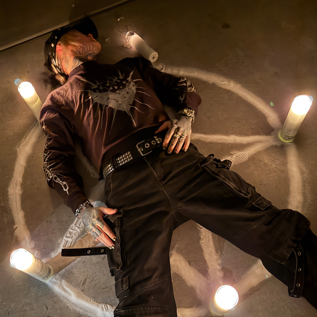 A heart wrapped in spikes glows on the chest, barbed wire chains crawl down the sleeves, and giant spiders loom acros...